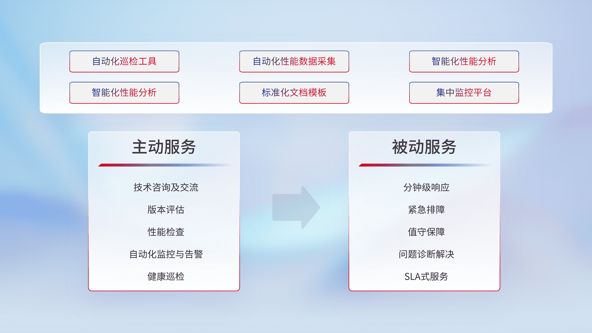 智能化工具和标准化文档,,,,保障服务质量,,,提供主动服务(包含技术咨询、、、版本评估、、、性能检查、、、、自动化监控与告警、、、健康巡检)和被动服务包含(分钟级响应、、紧急排障、、、值守保障、、、、问题诊断解决、、SLA服务)。。